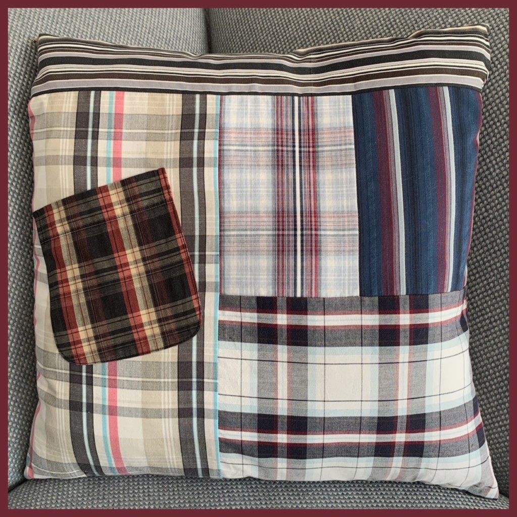 Van haar favoriete, versleten jas maakte ik deze kussenhoes. Een mooi cadeau voor haarzelf, een persoonlijke tastbare herinnering.