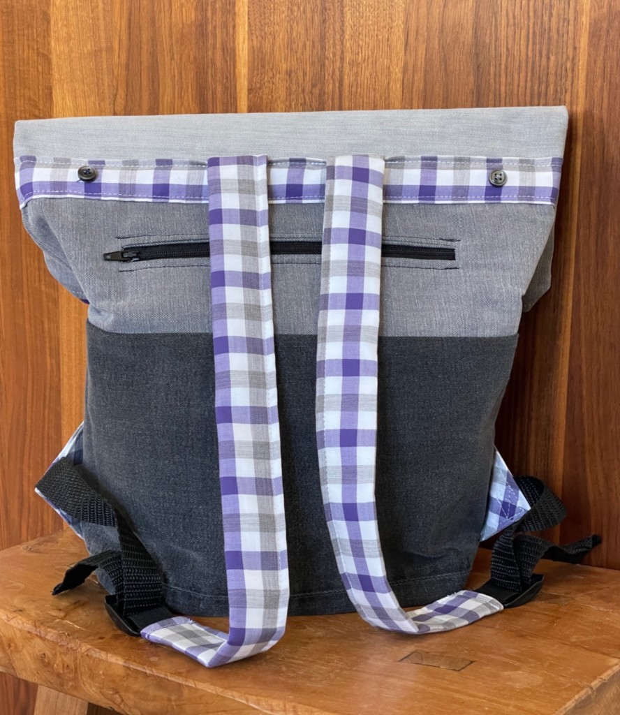 Deze (voorbeeld) rugtas is gemaakt uit 3 spijkerbroeken en een overhemd. De ritsen komen uit een oud vest en een kapotte, afgedankte tas. De sleutelhanger is een oud keycord, gespen en band van een oude laptoptas. Allemaal gerecycled, wel zo duurzaam!