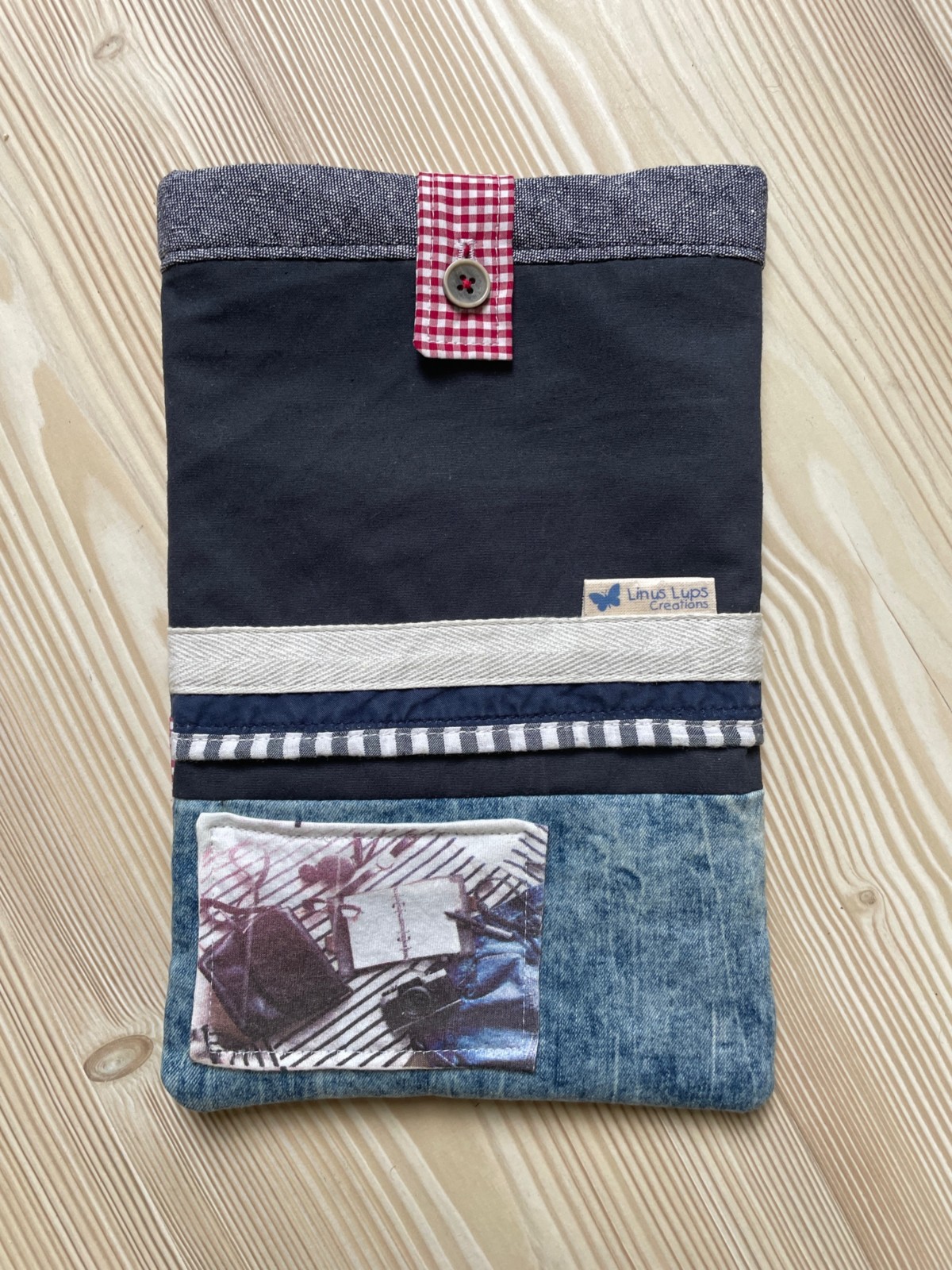 Ja, natuurlijk, dat doe ik met liefde! Hier zie je het resultaat, in dezelfde stijl als de tas. Zonder een specifiek verhaal, maar wel gemaakt van haar lievelingskleding. De applicatie is van haar favoriete shirtje en geeft de hoes een leuk zakelijk accent.