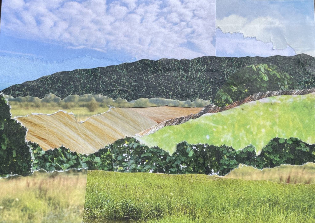 In de zomervakantie maakte ik van papier een collage van ons prachtige uitzicht. Eenmaal thuis kon ik het niet laten om het ook eens met textiel te proberen.