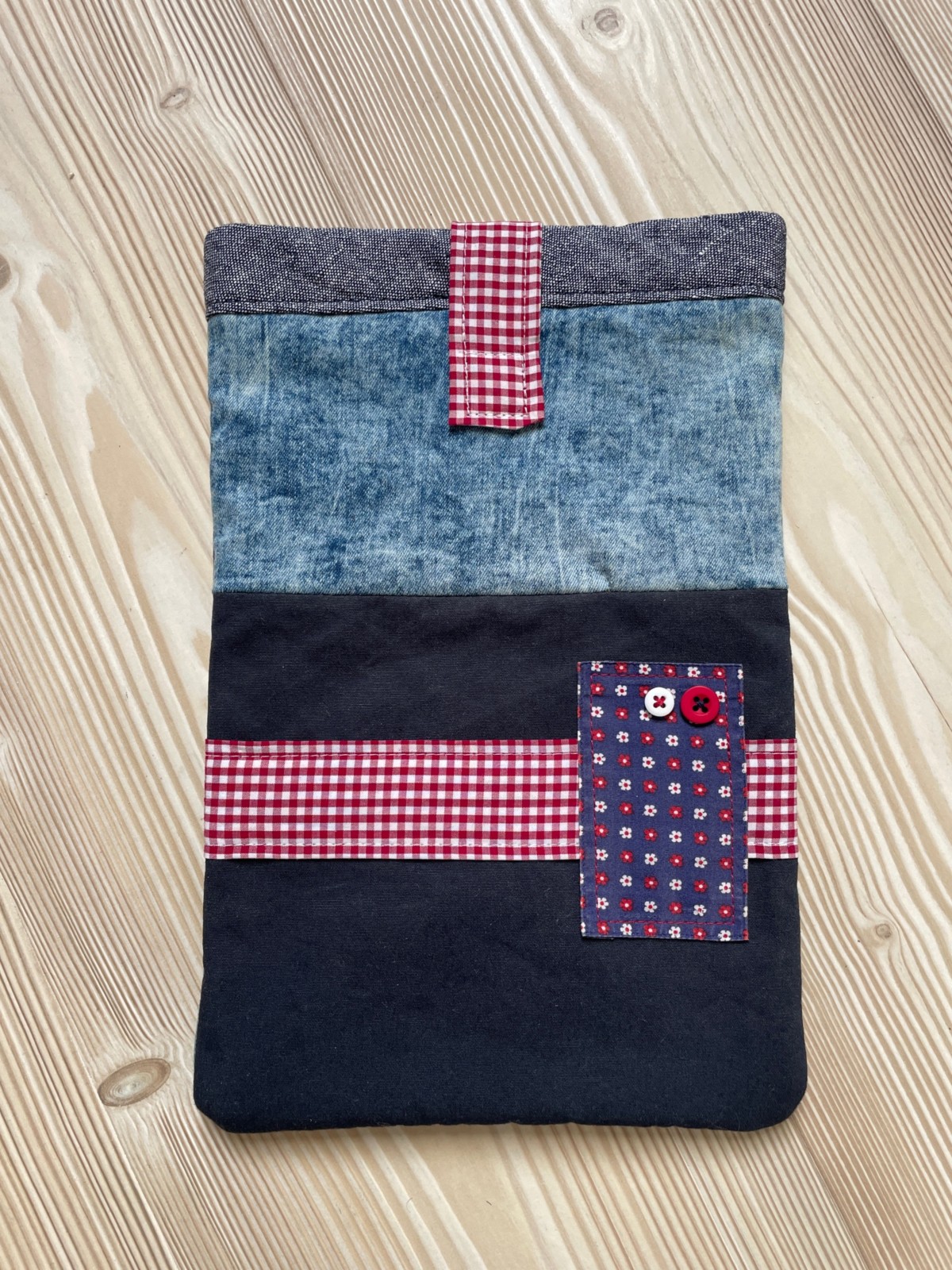 Ja, natuurlijk, dat doe ik met liefde! Hier zie je het resultaat, in dezelfde stijl als de tas. Zonder een specifiek verhaal, maar wel gemaakt van haar lievelingskleding. De applicatie is van haar favoriete shirtje en geeft de hoes een leuk zakelijk accent.