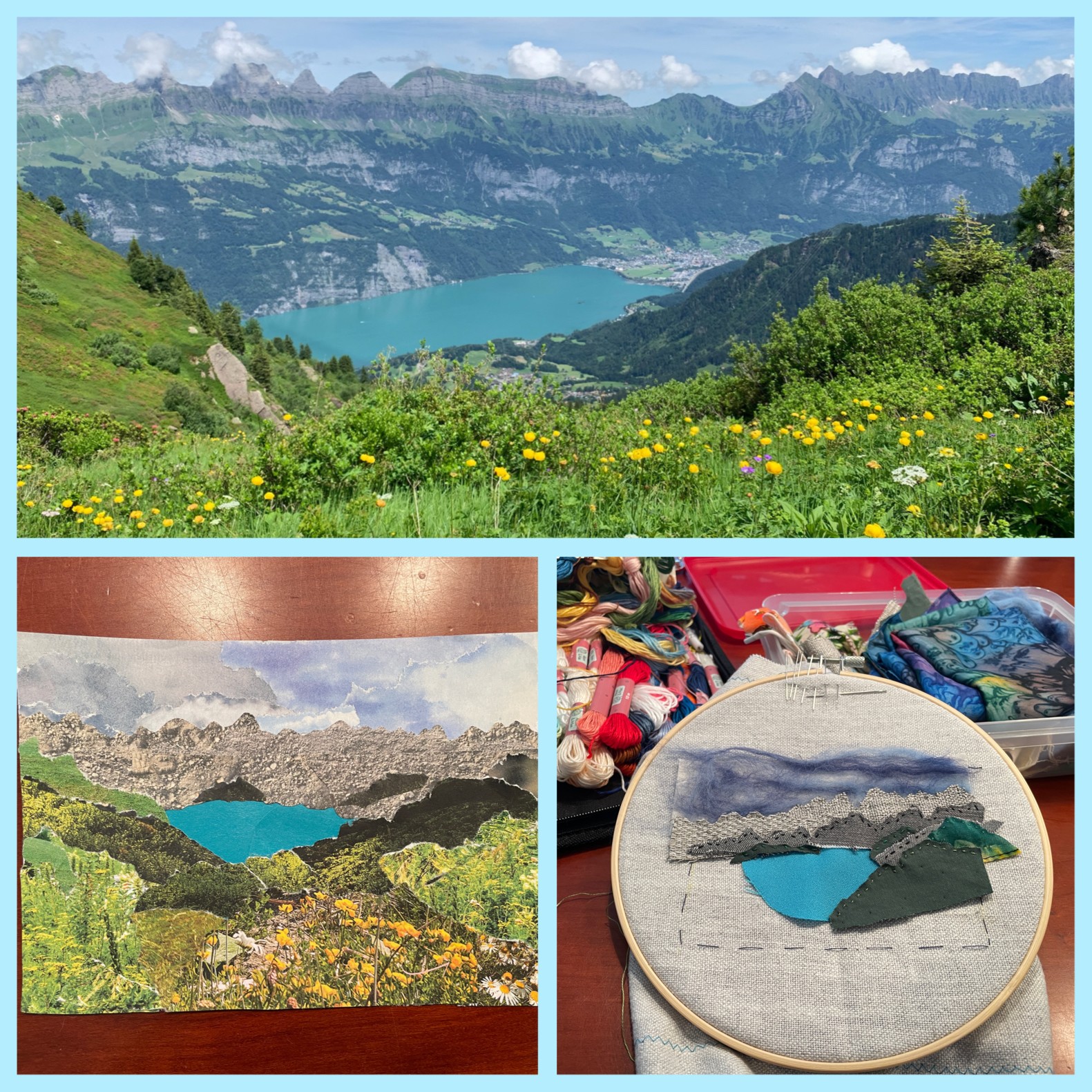 Geïnspireerd door dit prachtige uitzicht aan het meer ben ik begonnen om het landschap met stof, draad en geduld tot leven te wekken.Nog lang niet af, maar de bergen krijgen langzaam vorm!
