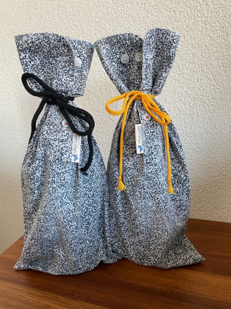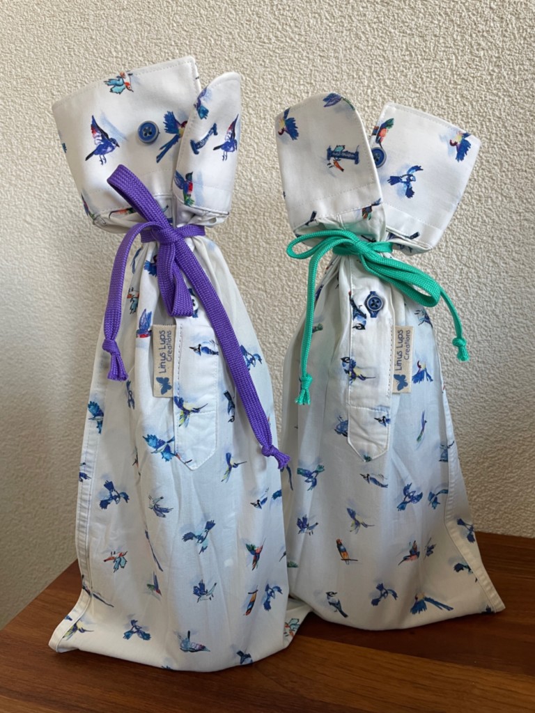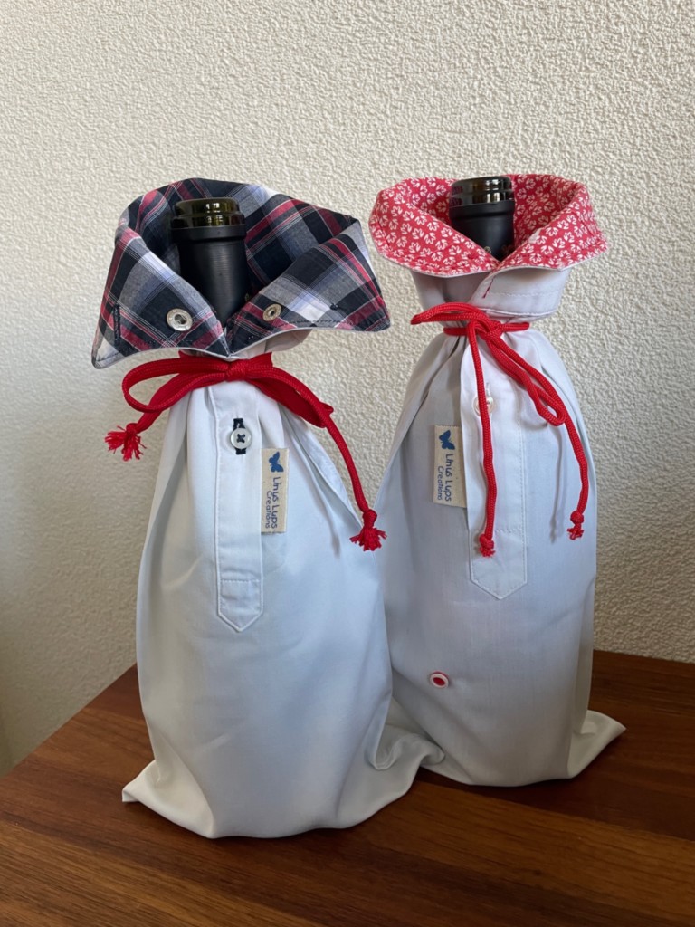 Geef je flesje sap of wijn in deze leuke cadeauverpakking, gemaakt van oude overhemden. Een cadeauverpakking die de ontvanger ook weer door kan geven.